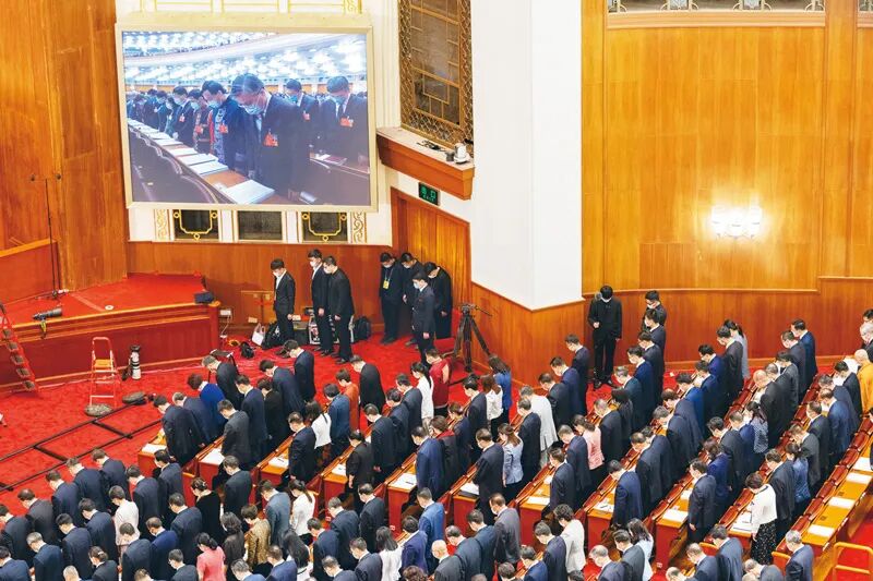 2020年5月22日,在十三届全国人大三次会议开幕会上,全体与会人员肃立默哀,向抗击新冠肺炎疫情牺牲烈士和逝世同胞表示深切哀悼。图为默哀现场。人民图片 翁奇羽/摄